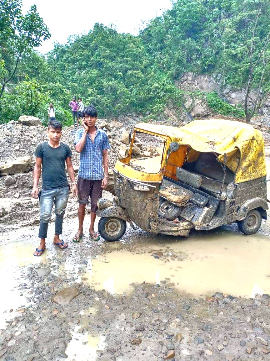 Occupants of an autorickshaw had a narrow escape as they were caught in a rockslide, near the Chumoükedima police check post, triggered by a bout of heavy rainfall that hit the foothills of Chumoükedima on Sunday afternoon. The police informed that the occupants escaped unhurt.