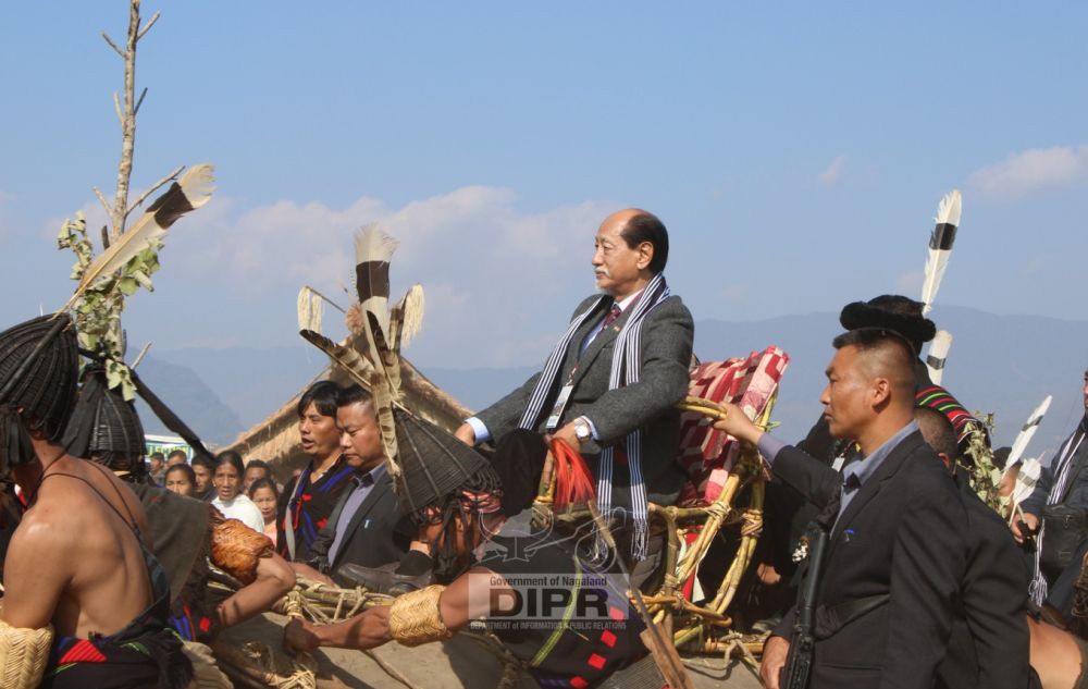 The Nagaland Chief Minister being accorded a welcome at the Khaozaosie Hok-Ah cum Mini Hornbill Festival at Nokhu on January 20. (DIPR Photo)