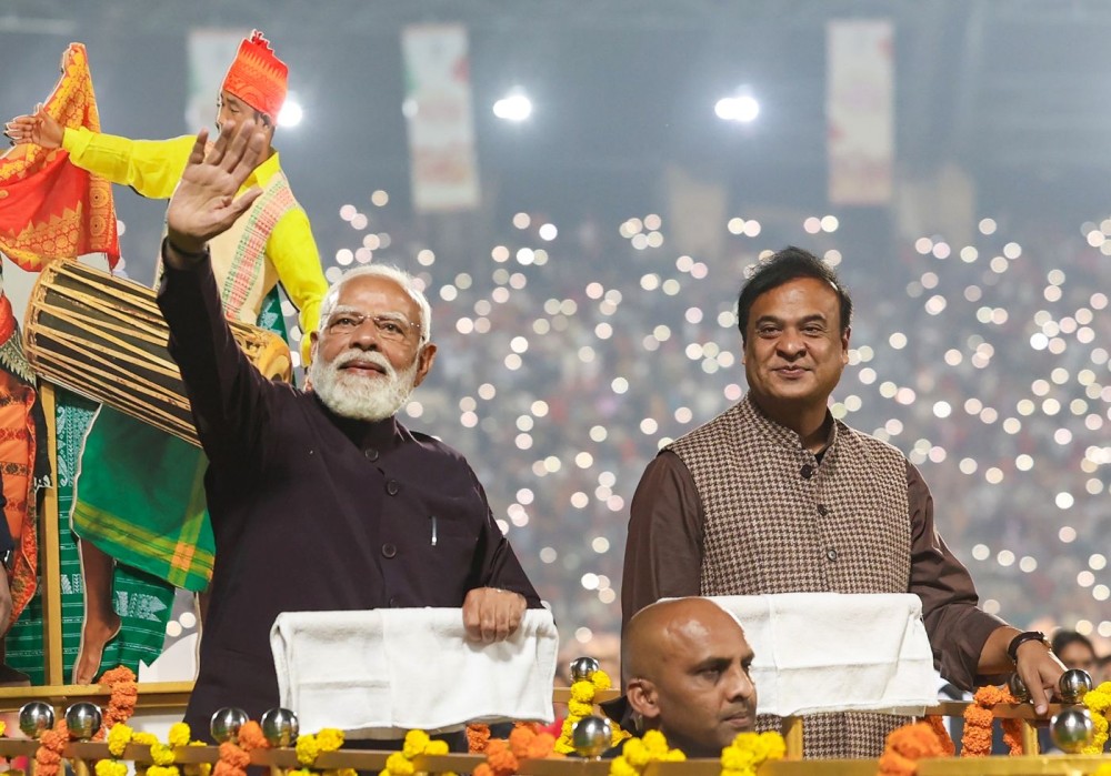 Guwahati: Prime Minister Narendra Modi and Assam Chief Minister Himanta Biswa Sarma attend Bagurumba Dhou, a traditional Bodo cultural programme, at the Sarusajai Sports Complex in Guwahati, Assam, on Saturday, January 17, 2026. (Photo: IANS/PMO)