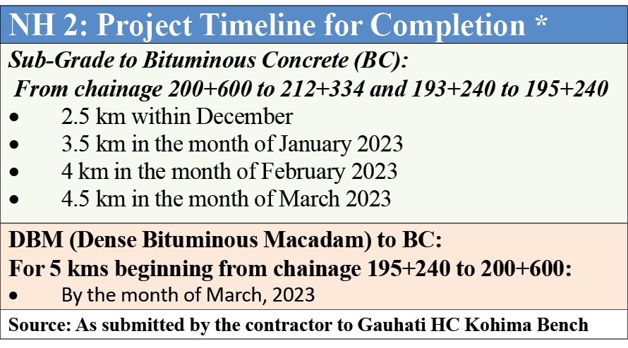 The contractor of the ongoing the ongoing National Highway (NH)-2 road construction project from Kohima-Mao Gate on December 2 submitted a new timeline to Gauhati High Court, reiterating to complete the project March 2023.