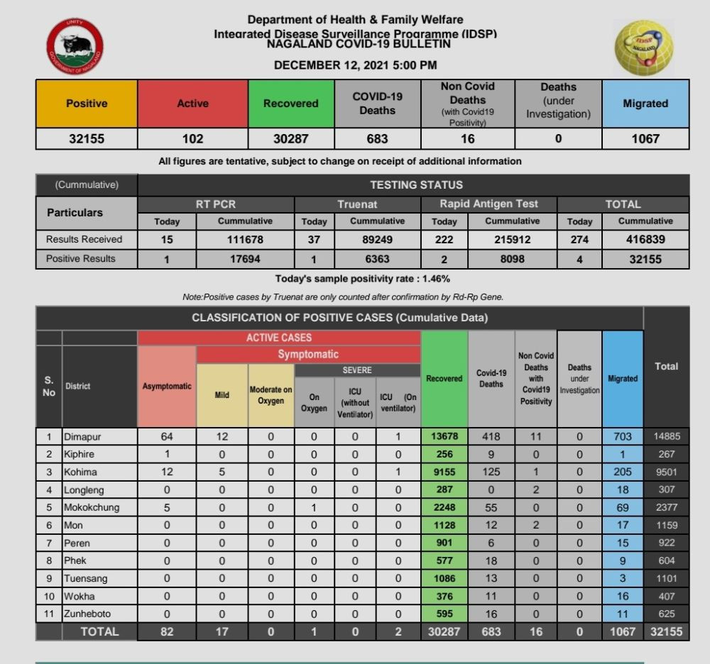 Dimapur, December 12 (MExN): Nagaland on December 12 recorded four new COVID-19 positive cases, while 3 others recovered from the infections. As per an update by the State Health Department, the new cases included 3 in Kohima and 1 in Mokokchung. There were also 2 recoveries from Dimapur and 1 from Mokokchung. A total of 274 samples were tested on Sunday, out of which 4 were positive, denoting a positivity rate of 1.46%. As per the daily COVID-19 bulletin issued by State IDSP, there were 102 active cases in Nagaland as of December 12. 5PM while the total cumulative total stood at 32155. A total of 30287 have also recovered from the infections while the State’s total COVID-19 deaths as of Sunday were 683.