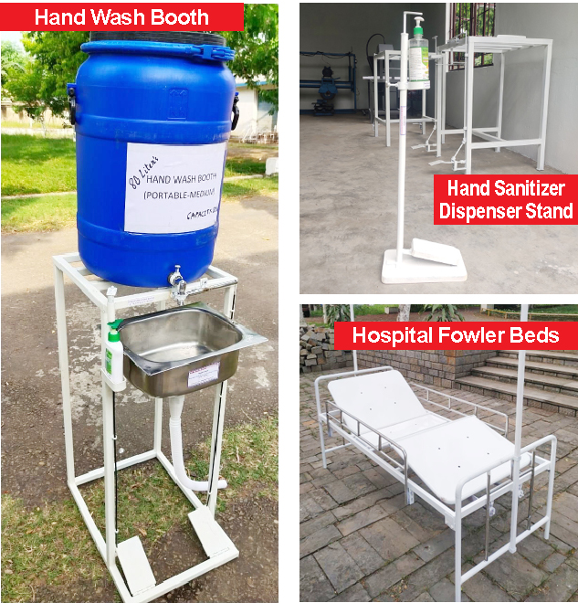 Hand Wash Booth: A foot operated hand wash booth having different tank capacities of 300 liters, 80 to 100 liters, 40 to 50 liters have been manufactured with features such as robust body with low maintenance, portable and low cost and hands touch free. A similar hand wash that can be directly connected to the running water pipe instead of a container has also been manufactured. Price of the hand wash booths ranges from Rs 4200 to Rs 10070 depending on the size of the container and nature of design.