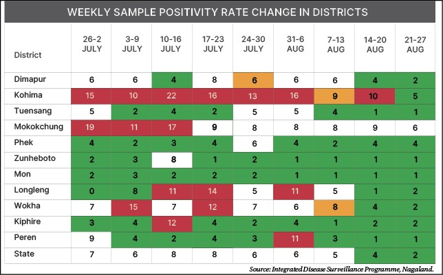 As per the state Integrated Disease Surveillance Programme’s (IDSP) weekly COVID roundup, released on August 28, highest number of samples were from Dimapur and Zunheboto out of the 15,846 results received during the week. It added, “This is the highest number of samples tested in a single week till date.”