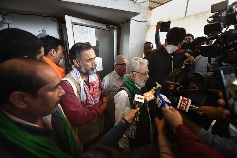 New Delhi: Farm leader Dr. Darshan Pal and Swaraj India Chief Yogendra Yadav come out after a farmers' meeting, at Singhu Border in New Delhi, Saturday, Nov. 20, 2021. (PTI Photo)
