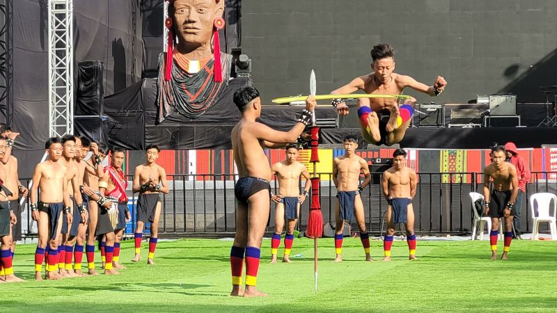 Rengma cultural troupe demonstrate high kick at Hornbill Festival 2021 at Kisama on December 4. (Morung Photo)