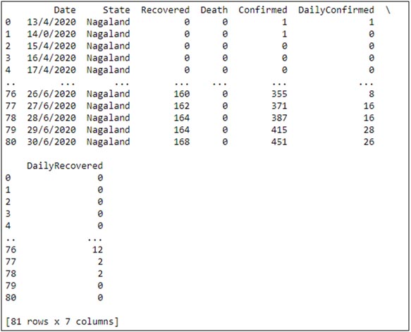 I have split up the MoHFW provided dataset filtering only for the state of Nagaland into a time series + consolidated data for this analysis. Columns are same for the first two data-frames as both of them contain time-series data. The nagaland_dataset is not a time-series but an aggregated data.