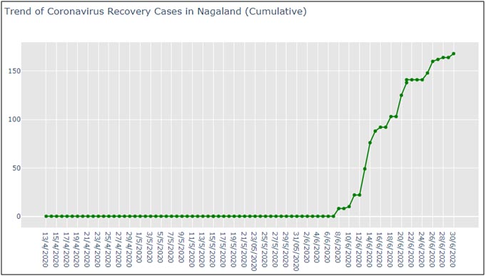 And here’s the historical trend of the recovered cases in Nagaland so far. We can see that the recovered cases too have climbed straight up within a very small data frame (or a period of time to the non “geeks”).