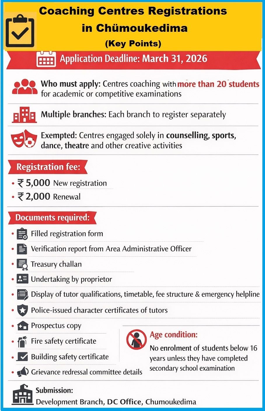 Chümoukedima, March 3 (MExN): The Deputy Commissioner Chümoukedima has directed all coaching centres operating within the district to apply for mandatory registration by March 31.