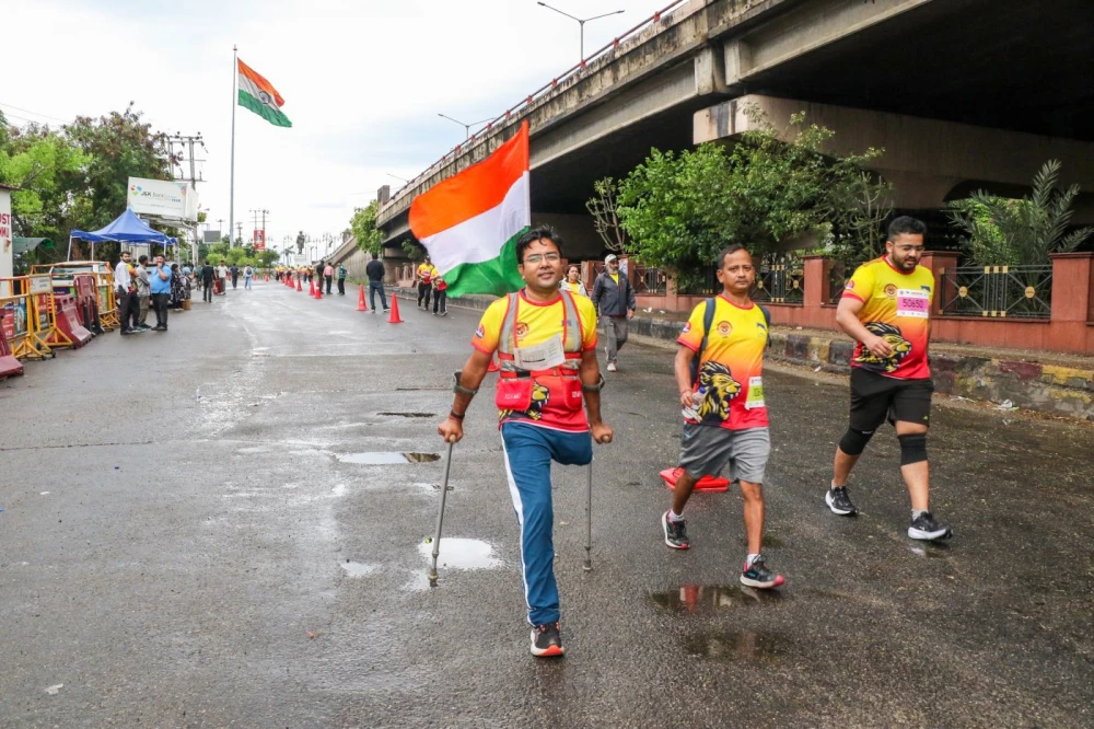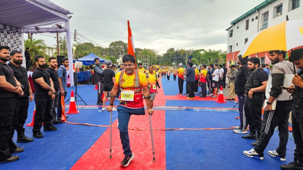 Jammu: A differently-abled participant crosses the finish line during the Jammu Marathon organised by the Jammu and Kashmir Tourism Department in Jammu on Sunday, March 29, 2026. (Photo: IANS)