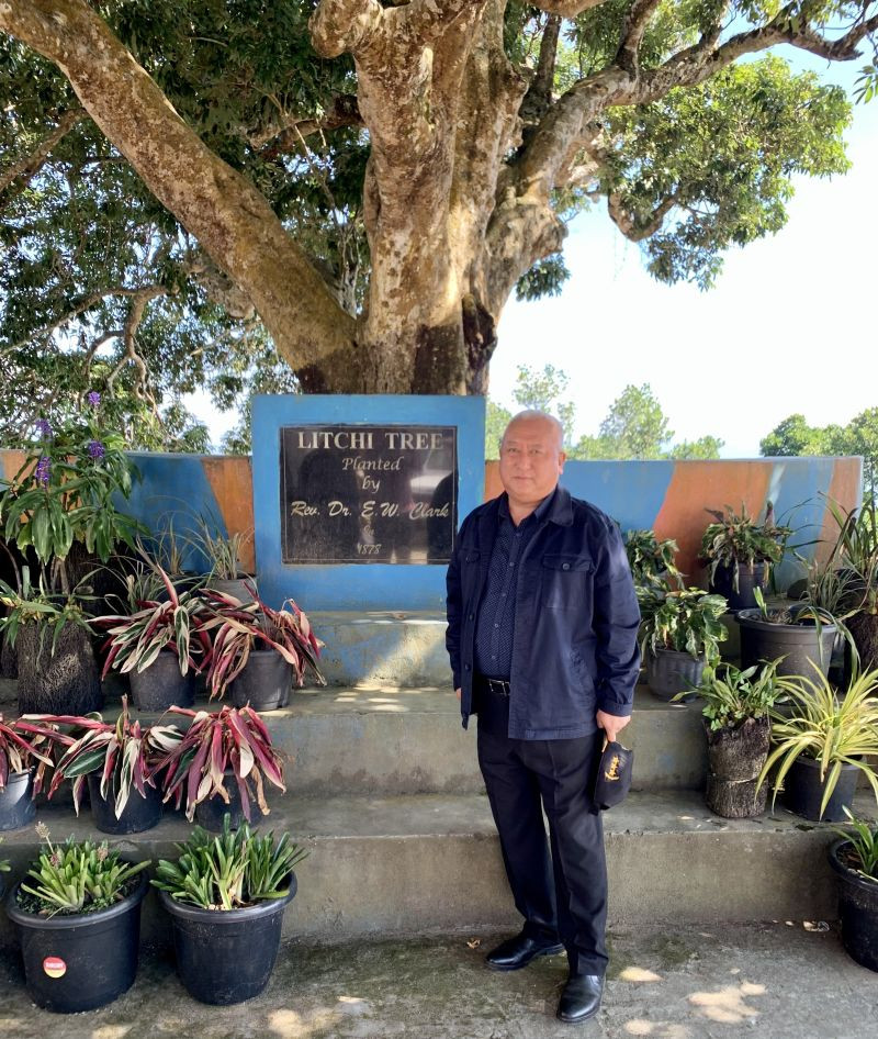 Seen in the picture is DGP Nagaland, T John LongkumerS beside the litchi tree planted by Dr E W Clark at Molungyimsen village.