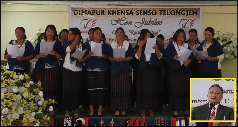 A song presentation at the golden jubilee celebration of the Dimapur Khensa Senso Telongjem on December 30 at the Cornerstone Higher Secondary School, Dimapur. (Inset) the Theme speaker, Rev C Teyong Kichu. (Morung Photo)