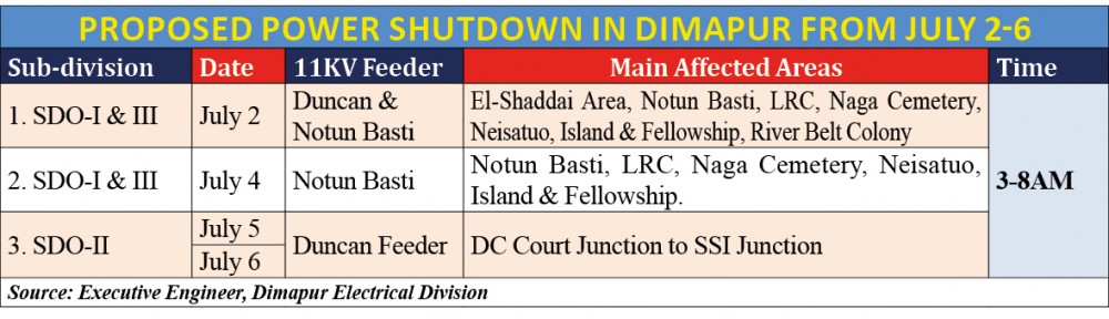 Meanwhile, in connection with the shifting, the Division informed that there will be localised power shutdown across Dimapur from July 2-6 from 3-8AM. (See table)