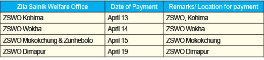 Kohima, March 25 (MExN): Payment of II World War Veteran Pension, Book Grant, Distress grant, Funeral grant, marriage grant and medical treatment for serious disease from State and ESM Welfare Fund will be disbursed as per details given below:-