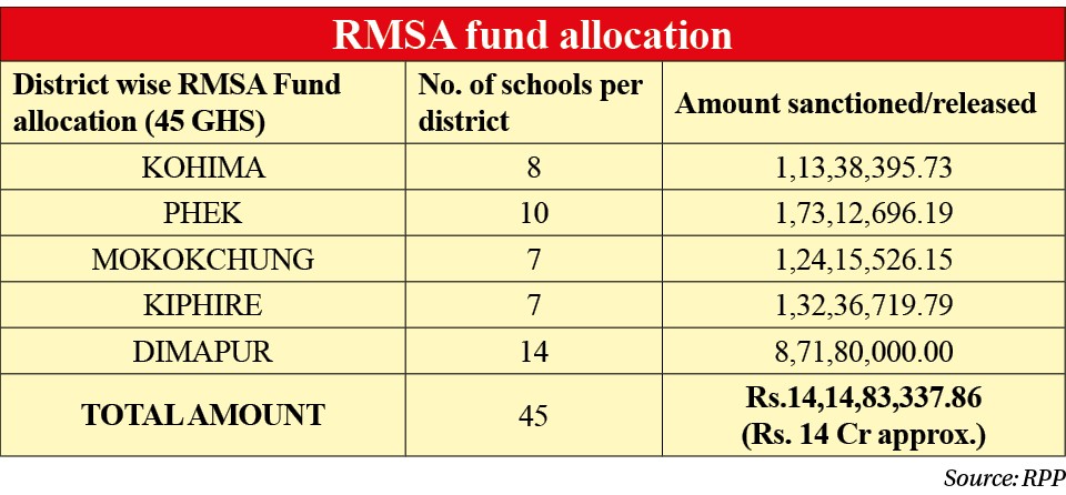 It meanwhile asked the DoSE Advisor to explain to the public as to why there is a “syndicate working overtime in his department.” “Under the same RMSA scheme, M/S Khedi Trade & Development Agency, Kohima, was awarded the contract to ‘upgrade’ 45 schools in 5 districts. He should explain whether any tender was floated. He should also furnish a clear picture to the public as to how much funds have been released under RMSA till date.” the RPP said.