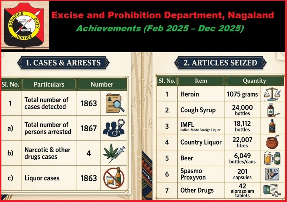 As per the Annual Administrative Report 2025–26 of the Excise & Prohibition Department, a total of 18,112 bottles of IMFL (Indian Made Foreign Liquor), 22,007 litres of country liquor, and 6,049 bottles/cans of beer were seized across Nagaland between February and December 2025.