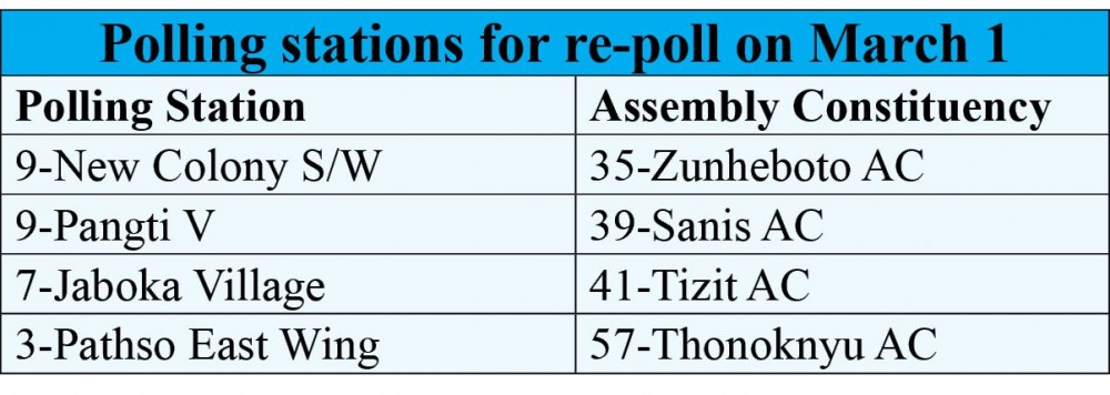 The polling stations ordered to undergo re-poll include 9-New Colony S/W under 35-Zunheboto AC; 9-Pangti V under 39 Sanis AC; 7-Jaboka Village under 41-Tizit AC; and 3-Pathso East Wing under 57-Thonoknyu AC.