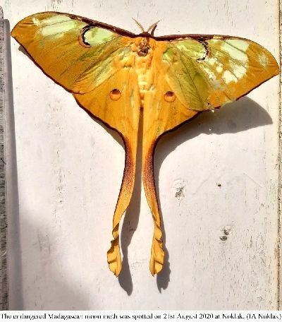 Noklak, August 22 (MExN): A nocturnal moth species, the Endangered Madagascan Moon Moth was spotted in Nagaland’s newly-created district, Noklak, on August 21.