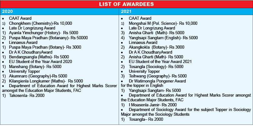 Students achieving excellence in 2020 and 2021 from various departments were given as certificate and cash incentives during the event while Imlinungla, Assistant Professor, Zoology Department made special prayers for the awardee students and passed out students in general, the release added.
