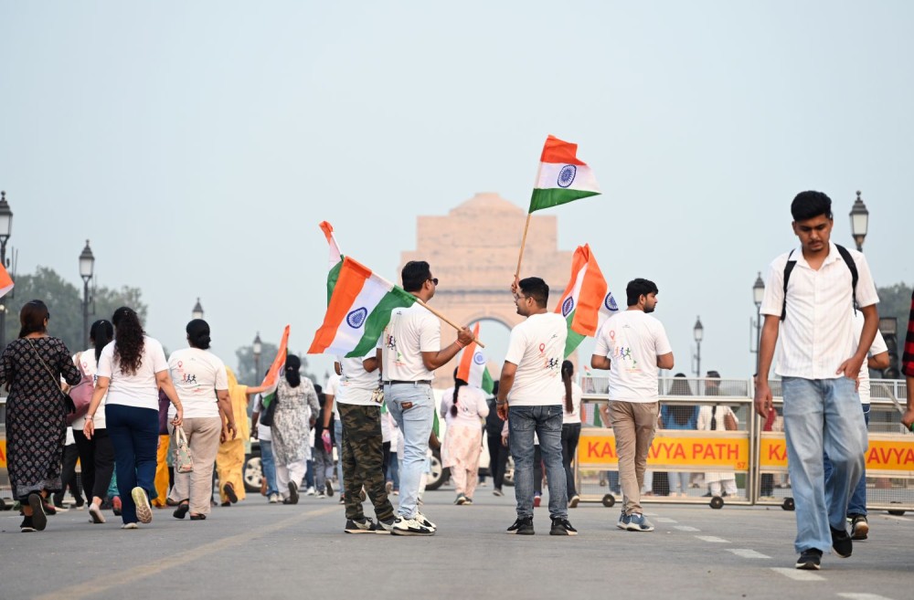 New Delhi: People holding national flags celebrate the 150th birth anniversary of Sardar Vallabhbhai Patel, observed as Rashtriya Ekta Diwas (National Unity Day), at India Gate in New Delhi on Friday, October 31, 2025. (Photo: IANS/Deepak Kumar)