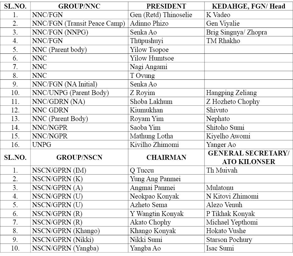 A press release from the MIP of the FGN said that there are currently 26 recognized political groups in Nagaland. It added that “many people incorrectly consider the Naga National Council (NNC) and the Federal Government of Nagaland (FGN) as part of this list.” It said that the NNC is “a mandated Naga Political Institution and that the FGN represents its legal Naga National Government.”