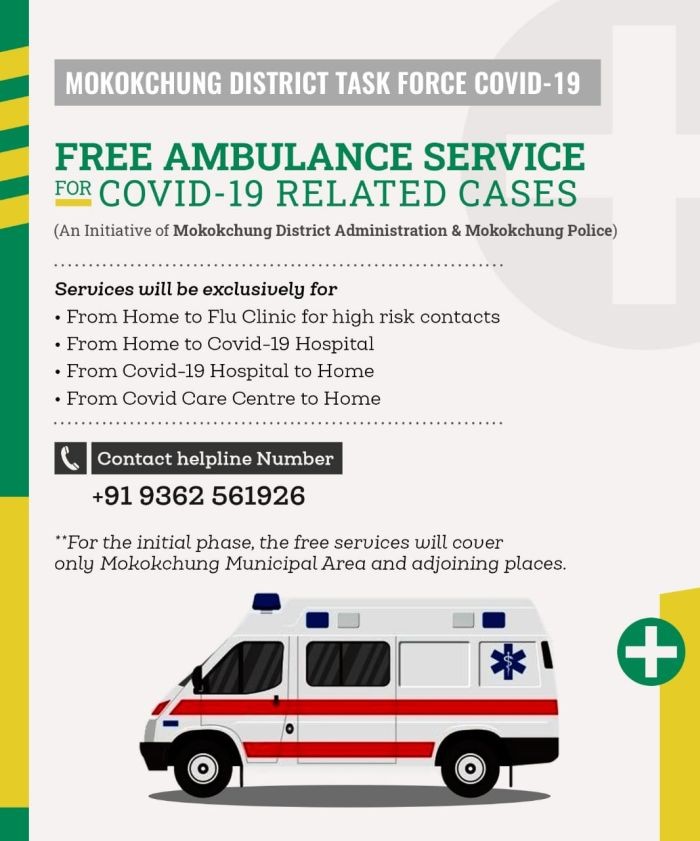 Mokokchung, June 3 (MExN): The District Administration Mokokchung and Mokokchung Police have initiated a free ambulance services for COVID-19 related uses in Mokokchung.