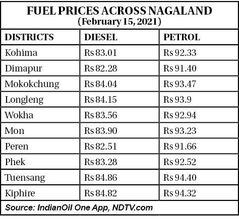 Fuel Prices Across Nagaland - February 15, 2021