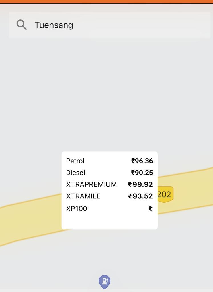 Fuel prices in Tuensang Headquarter on June 1 as per the IndianOil One. (Screenshot)