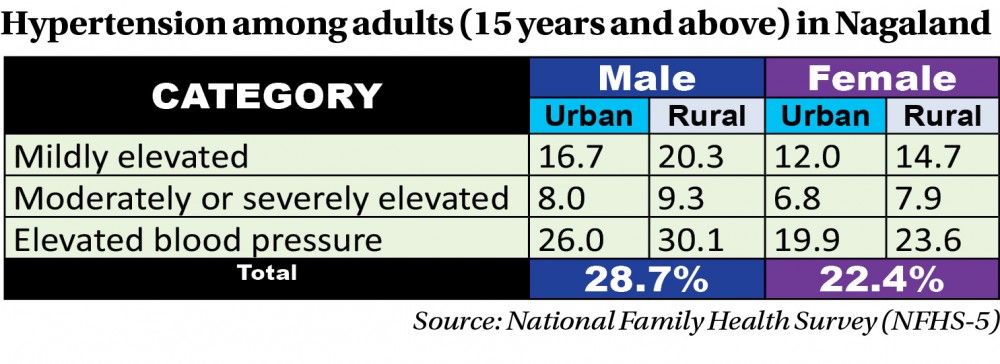 According to the National Family Health Survey (NFHS-5), the prevalence rate of hypertension in Nagaland in the age group of 15 years and above was 22.4% in female and 28.7% in male. (See box)