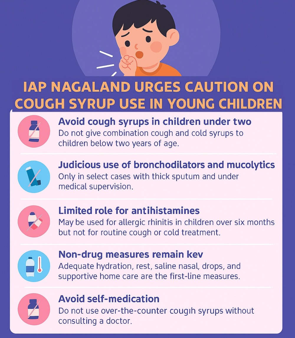 Dimapur, October 5 (MExN): The Indian Academy of Pediatrics (IAP) Nagaland State Branch has alerted parents and caregivers to exercise caution regarding the use of cough syrups in children, following a recent advisory from the Directorate General of Health Services (DGHS), Government of India.