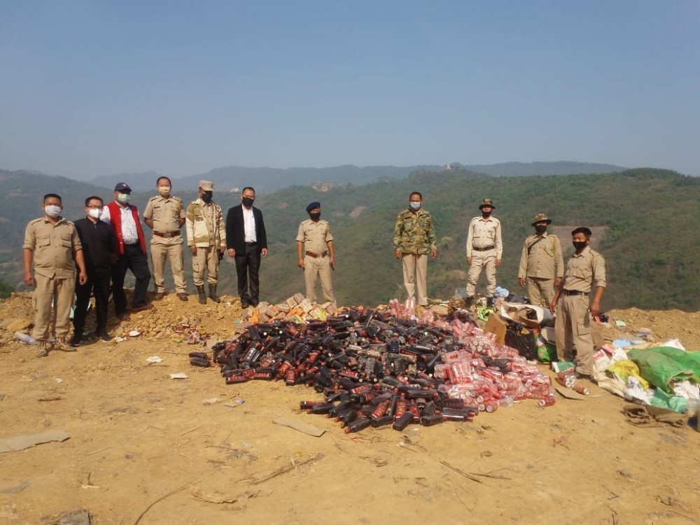 Phek, April 23 (MExN): Destruction of seized IMFL and other contraband items was carried out under the supervision of Public Prosecutor, Phek and in the presence of the authorized officers including EAC, Judicial District Administration, SDPO Phek, DB, Office of Deputy Commissioner, UBSI, PI Court Phek and ASI, Phek Police Station on April 22.