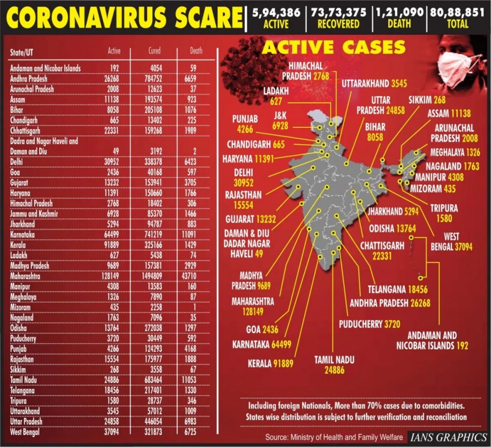 Out of the total Covid-19 cases, 5,94,386 are currently active, 73,73,375 have been discharged, while 1,21,090 lost the battle against the pandemic.