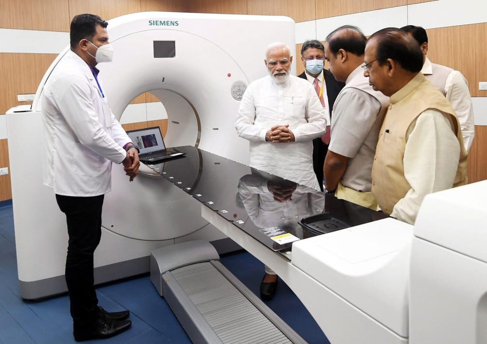 Dibrugarh : Prime Minister Narendra Modi and Assam Chief Minister Himant Biswa Sarma during the dedication of the seven new cancer hospitals to the Nation, at Assam Medical College, in Dibrugarh on Thursday, April 28, 2022. (Photo:PIB)
