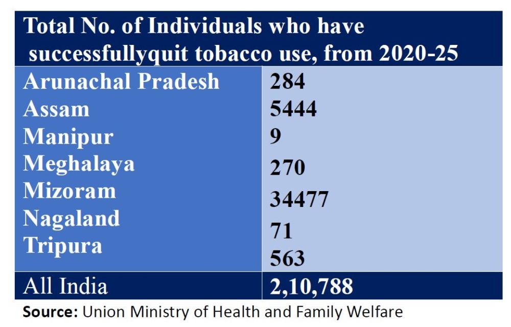 Within the North East, Mizoram reported the highest number of individuals quitting tobacco during the five-year period, at 34,477. It was followed by Assam (5,444), Arunachal Pradesh (284), Tripura (563), Meghalaya (270), and Manipur (9).