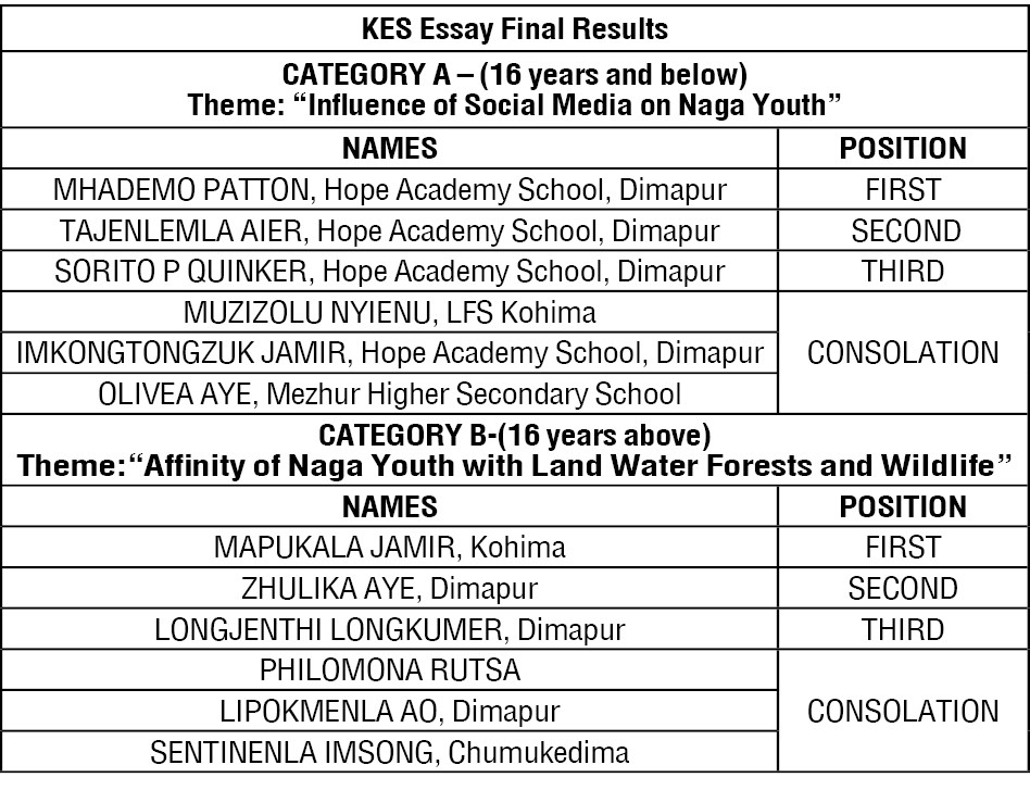 Twenty best essays in each category were shortlisted by an in-house team of KES and in turn a panel of three independent judges for each category evaluated the same. The judges were drawn from the fields of education, writers and the NGO sector working in the field of environment and livelihood amongst Naga communities, the release stated.