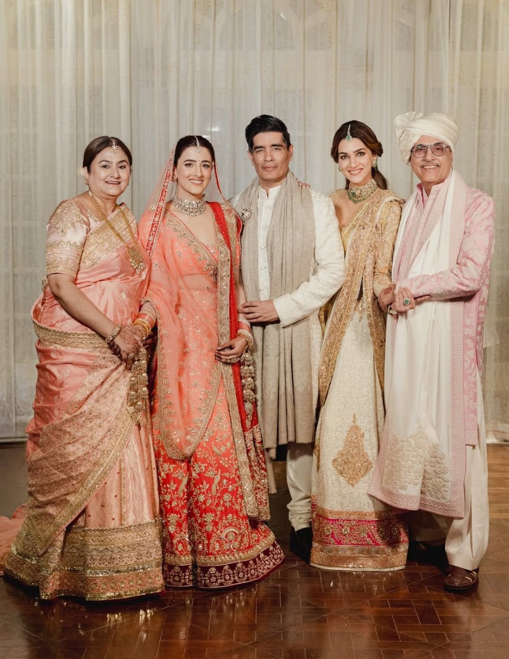 Sharing some photos of her and her family members posing with the designer, Kriti expressed, "Special post for a special friend @manishmalhotra05 !!! Thank you for dressing up my whole family so beautifully for the hindu wedding! (sic)"
