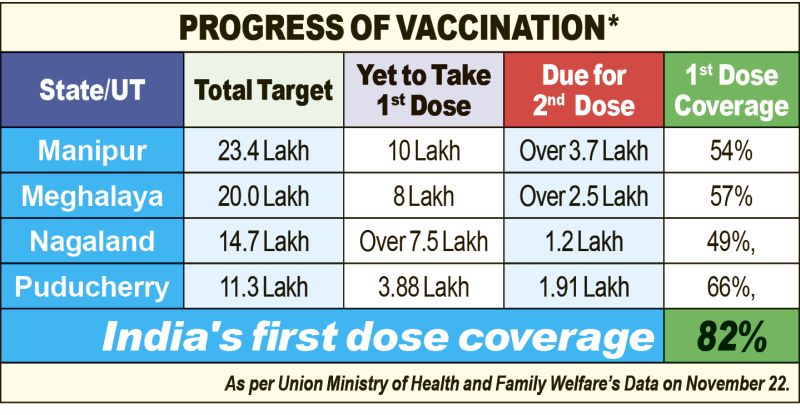 Union Health Minister Dr Mansukh Mandaviya, on November 22, urged the States of Nagaland, Meghalaya and Manipur as well as the Union Territory of Puducherry to launch an aggressive campaign to increase the pace and ensure full COVID-19 inoculation of the adult population.