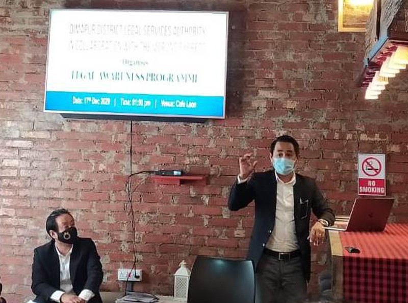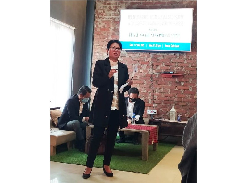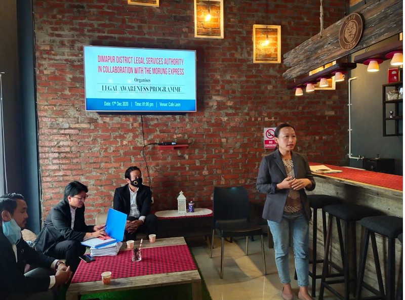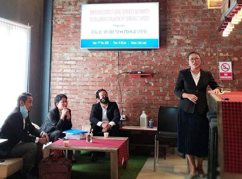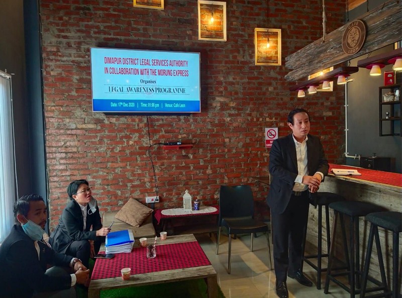 Members from Dimapur District Legal Service Authority (DDLSA) during the legal awareness programme conducted in collaboration with The Morung Express at Café Leon, Dimapur on December 17. The awareness programme mainly focused on the topic of “Sexual Harassment at Workplace Act 2013” which was presented by Chief Judicial Magistrate (CJM) and also DDLSA Secretary, Somet C Chang. During the programme, Dzuvino Chadi, Panel Lawyer, DDLSA presented on Food Security Act; Moatila Ao, Panel Lawyer, DDLSA spoke on Health schemes and social welfare schemes; and Yanbemo Ngullie, Panel Lawyer, DDLSA spoke on National Flag Code and Fundamental Duties. The programme was chaired by Sangto Longchar, Panel Lawyer, DDLSA. (Morung Photo)