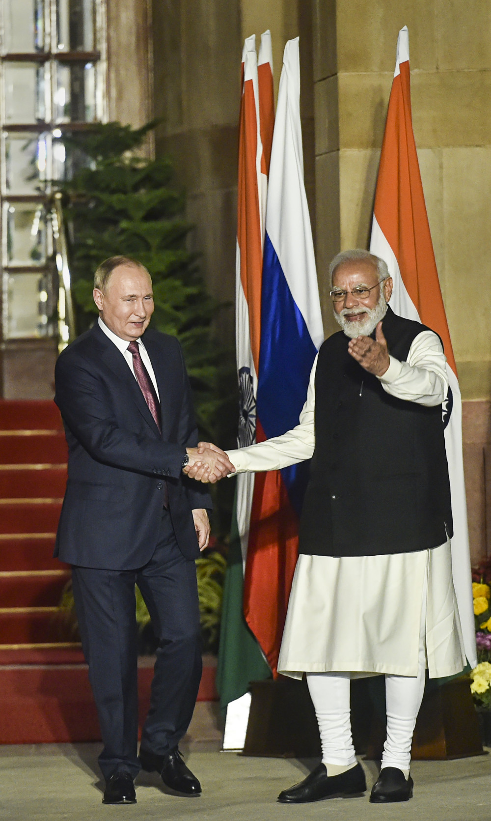 New Delhi: Prime Minister Narendra Modi receives Russian President Vladimir Putin at Hyderabad House in New Delhi, Monday, Dec. 6, 2021. (PTI Photo/Arun Sharma)