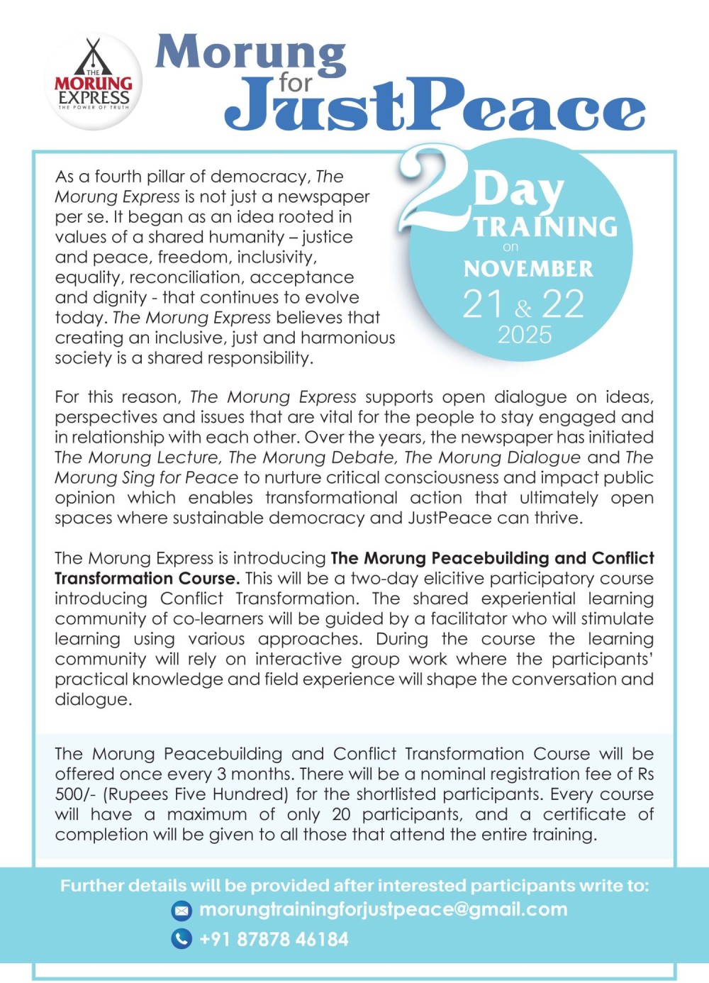 Further details will be provided after interested participants write to email: morungtrainingforjustpeace@gmail.com and mobile number: +91 87878 46184
