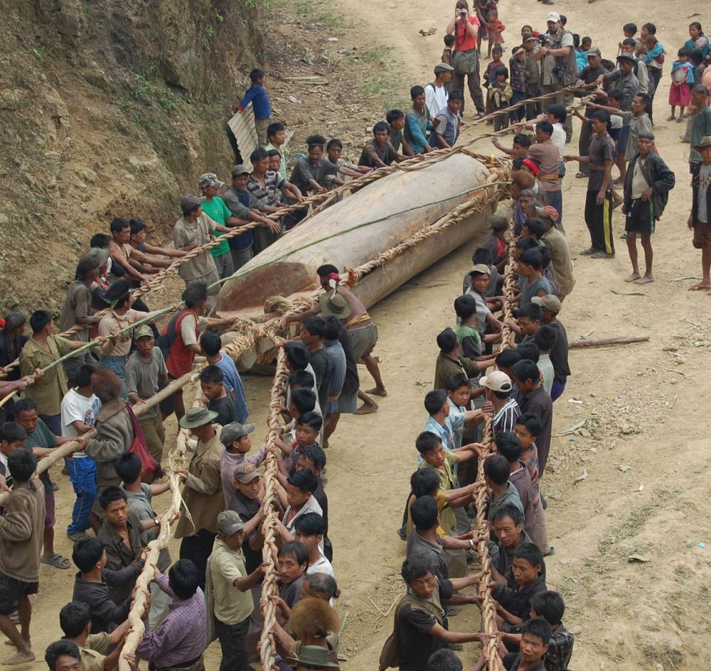 Similarly, in many Naga villages where there are morungs, woodcarvings are displayed either on a panel or on the beams inside. In Konyak and Yimchung villages, the morungs are still alive and utilized with a mixture of traditional and contemporary ethos. Cultural symbols are also engraved on the logdrums. Even today, such carvings are done when new logdrums are brought to the morungs. E.g. the new logdrum for one of the morungs in Lungwa has a tiger engraved at both ends of the logdrum.