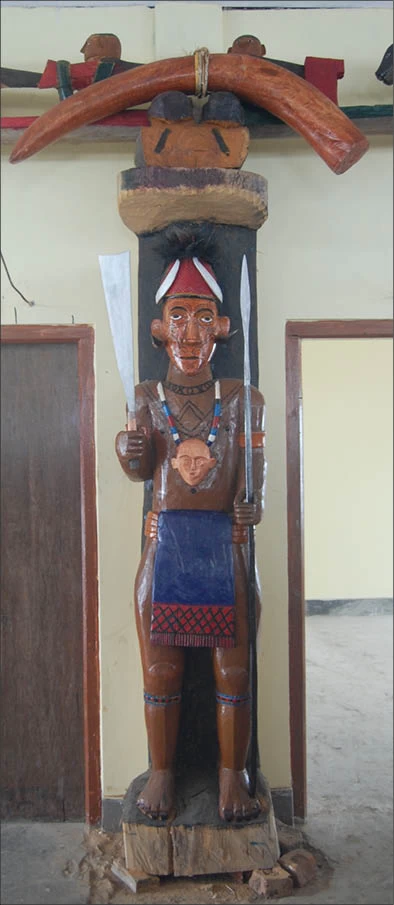 Another interesting development in the evolution of Naga woodcarving is the chief’s morung (Anghpan) in Chi village in Mon. In this case, the new morung functions as a morung and also as a tourist guesthouse. The woodcarvings inside have modern touch. There is a bigger than life-size woodcarving of the Angh that is painted in color. The other symbols such as elephants, tiger and skulls are also represented in the carvings. The only feast given for this morung has been not by the Angh himself but by the village and the people belonging to that particular morung on the day of the inauguration of the morung. This is a fine case of innovation.