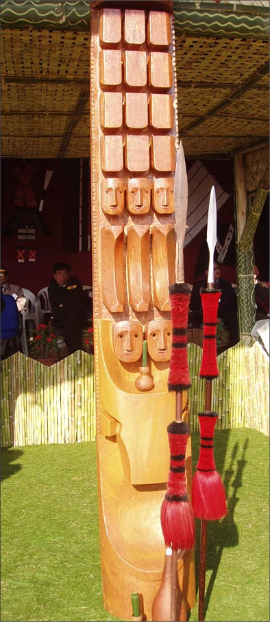 Not to be forgotten are the Anghs’ houses in Konyak areas where the woodcarvings are symbolic of the Anghs powers and feats. One such example is the huge woodcarving piece in the showroom of the Angh’s house in Lungwa. Next to the woodcarving is a bench that functions as the throne of the Angh. The woodcarving in this case has a royal function because it is the background for the throne.