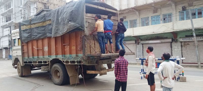 Labourers unload essential commodities in Nagaland’s state capital Kohima on Monday, May 24. During the lockdown period, the government permits movement of vehicles carrying essential commodities/food items and medical supplies including oxygen, oxygen cylinders and other medical equipment. (Morung Photo by Chizokho Vero)