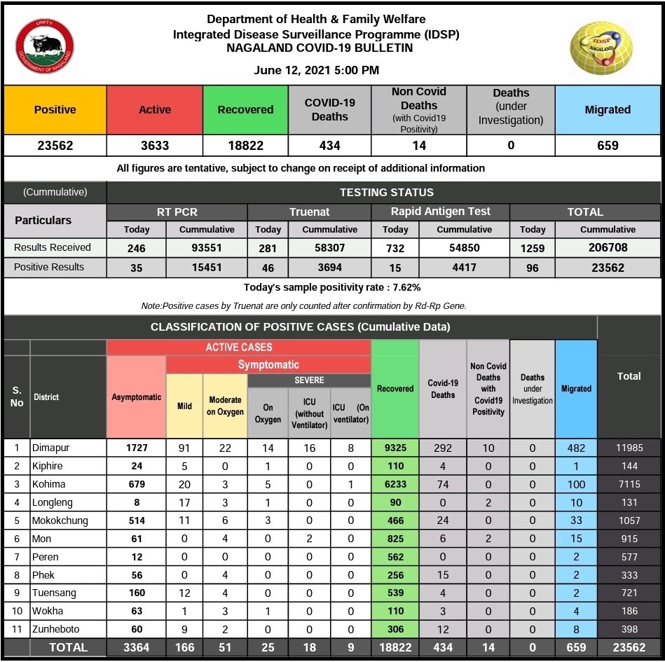 Dimapur, June 12 (MExN): Nagaland’s cumulative tally of COVID-19 cases reached 23,562 on Saturday after the state reported 96 new cases from seven districts.