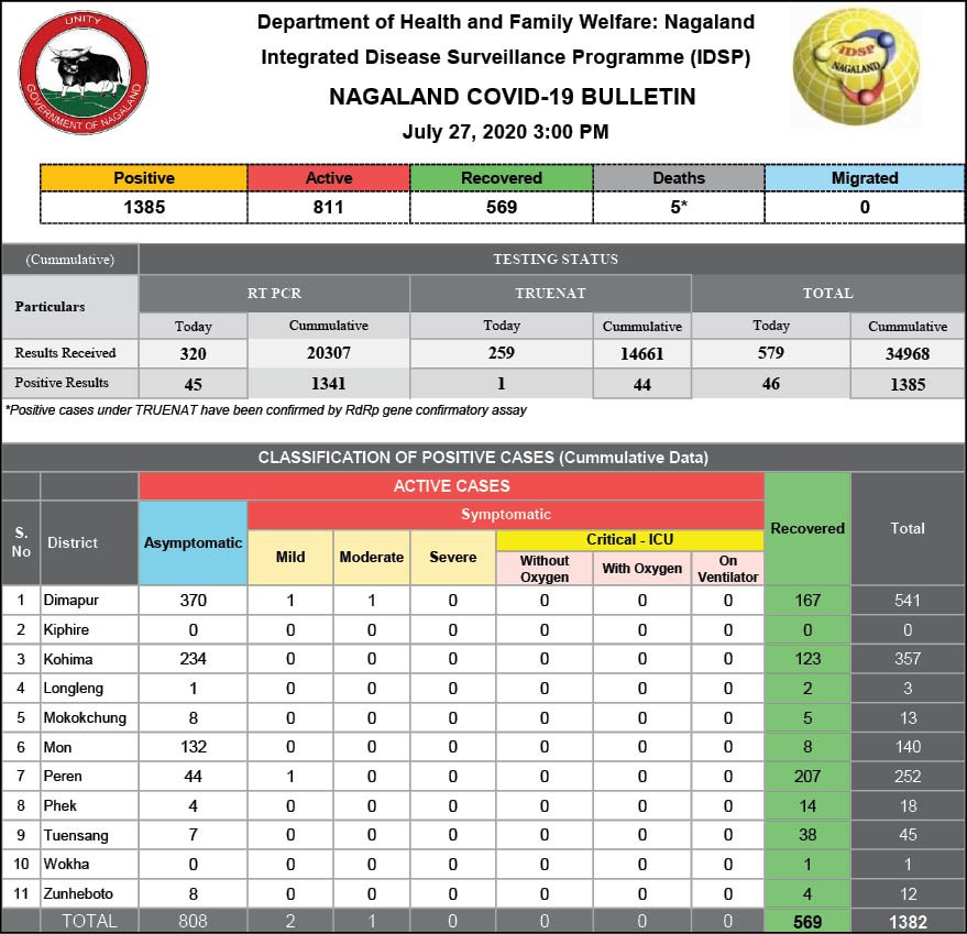 With this, the status of total positive cases in the state now stands at 1385 with 569 recoveries as of July 27.