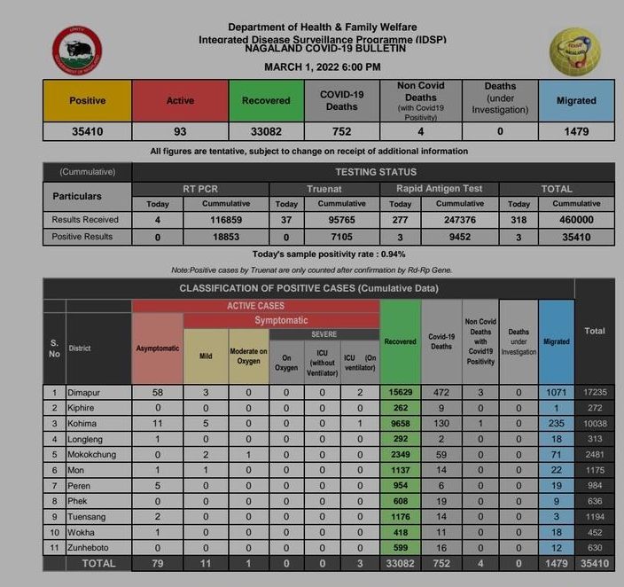 Dimapur, March 1 (MExN): On Tuesday, Nagaland reported three new cases from Dimapur, Kohima and Mokokchung districts, all of which were detected during self tests and random testing.