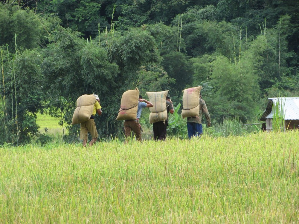 Farmers carry harvested produce in sacks across a field in Nagaland, where agriculture sustains nearly 70% of the population. The Nagaland Agriculture Policy 2025 flags climate change as a growing threat to rain-fed farming and underscores climate-smart, resilient practices to safeguard the sector. (Morung File Photo)
