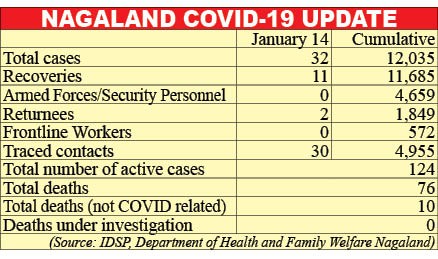 DIMAPUR, JANUARY 14 (MExN): 32 new positive cases of COVID-19 were detected in Nagaland on January 14. Meanwhile 11 new recoveries were also recorded.