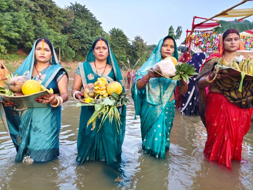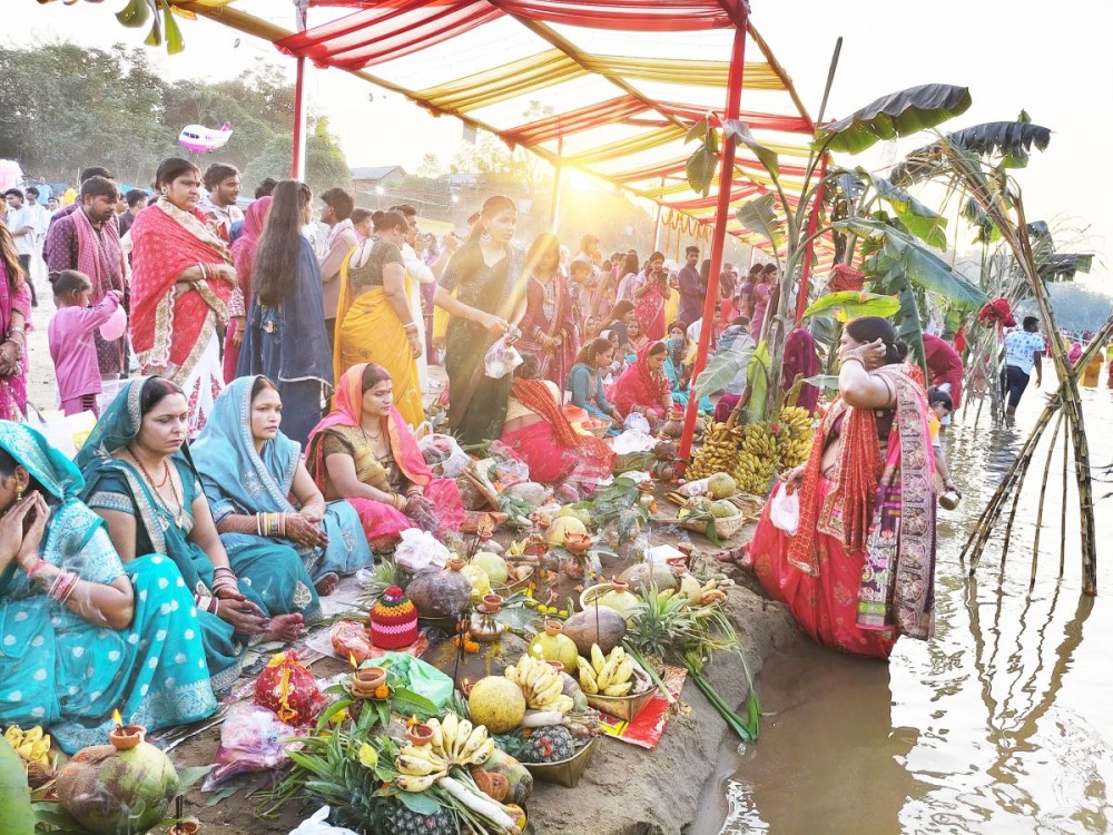 Devotees offer ‘Arghya’ to the setting Sun during Chhath Puja celebrations on the banks of the River Dhansiri in Ura Villa Colony, Dimapur on October 27. The event, organised by the Nagaland Bhojpuri Samaj, brought together the local Bhojpuri community and people from various backgrounds to perform traditional rituals. Celebrated primarily by communities from Bihar, Jharkhand, Uttar Pradesh, and Nepal, Chhath Puja is revered for its themes of “faith, purity, and gratitude.” The sacred festivities, marked by great devotion and enthusiasm, will culminate on October 28.(Morung Photo)
