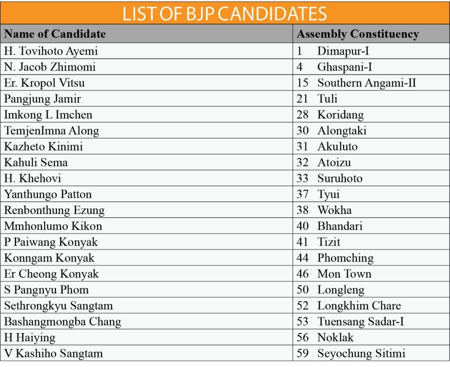 Dimapur, February 2 (MExN): The Nagaland BJP today announced a list of 20 candidates for the upcoming elections. This comes as State BJP leaders have tried to downplay any issue of disharmony within the party with regard to allocation of party tickets.
